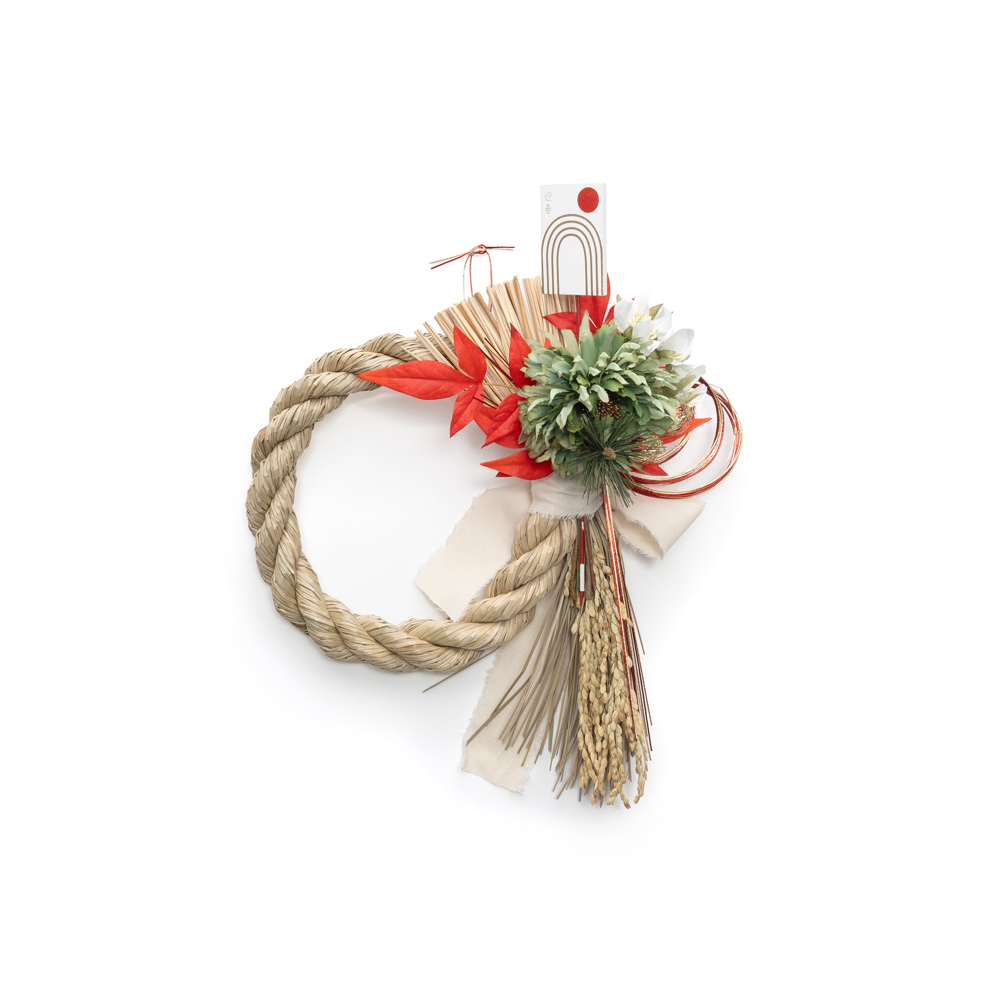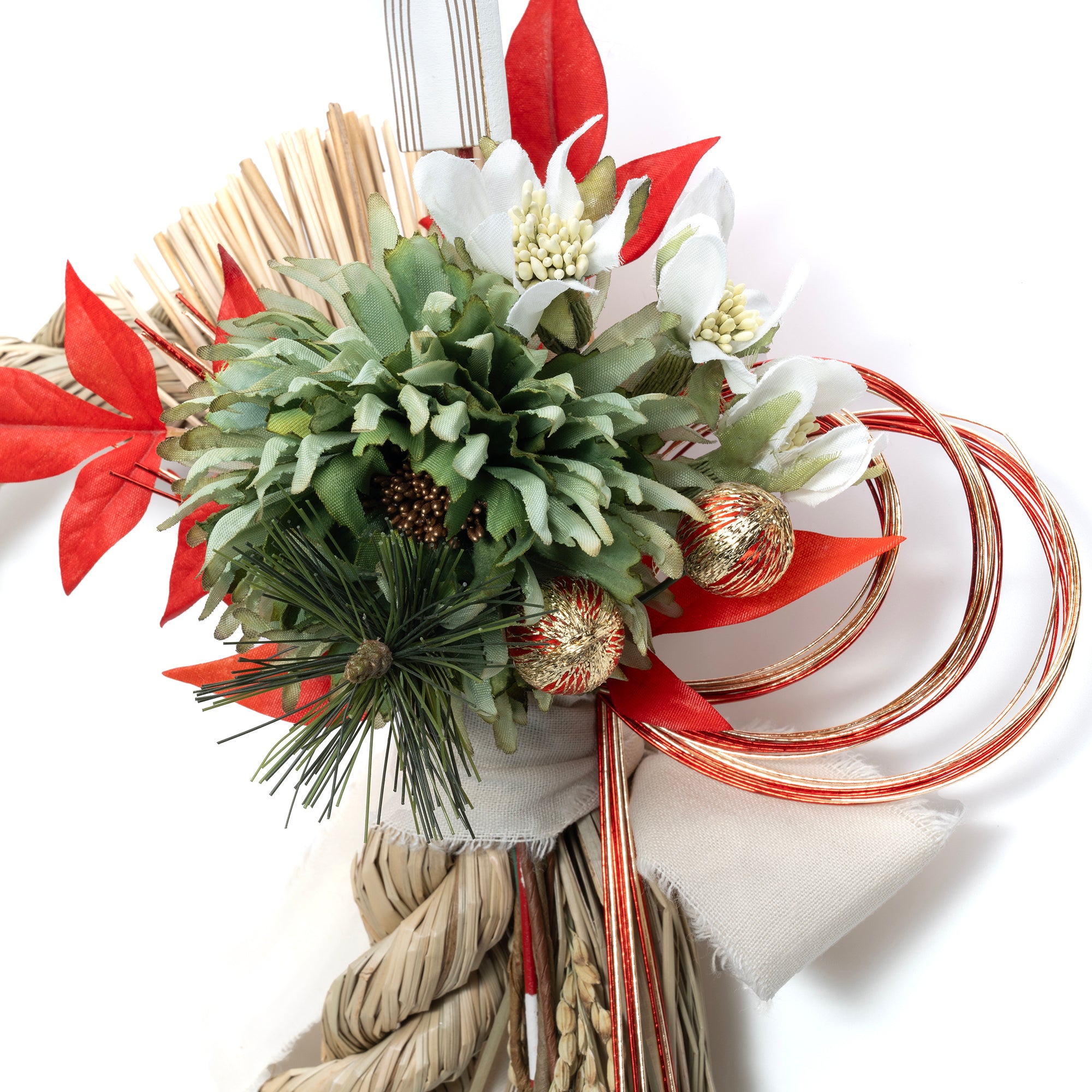 お正月にしめ縄を玄関に飾るのは、その家が歳神様(としがみさま)を迎えるのにふさわしい場所であることを示すためです。コンパクトで使いやすいしめ縄に、縁起の良い松、南天の葉に加え、「不老長寿」「菊を生けると 良い子に育つ」「 菊を飾れば 福が到来」 と言われるほど験のよい菊をアレンジしています。和風建築は勿論、マンションやファッショナブルかつシンプルな空間にも映える飾りで福を呼び込みましょう。
