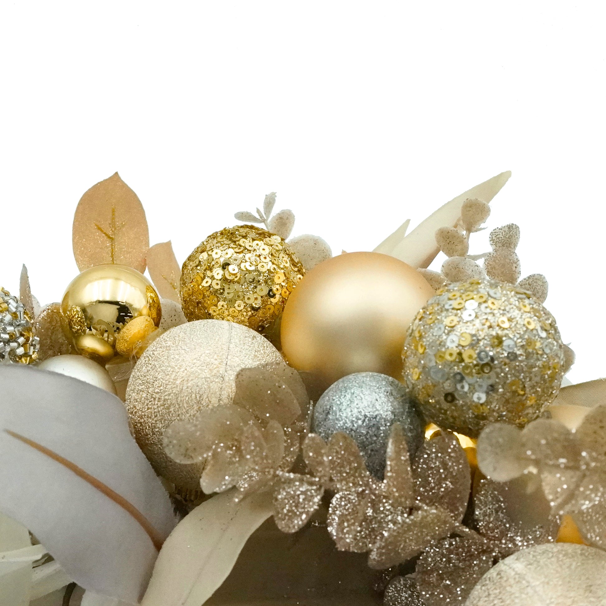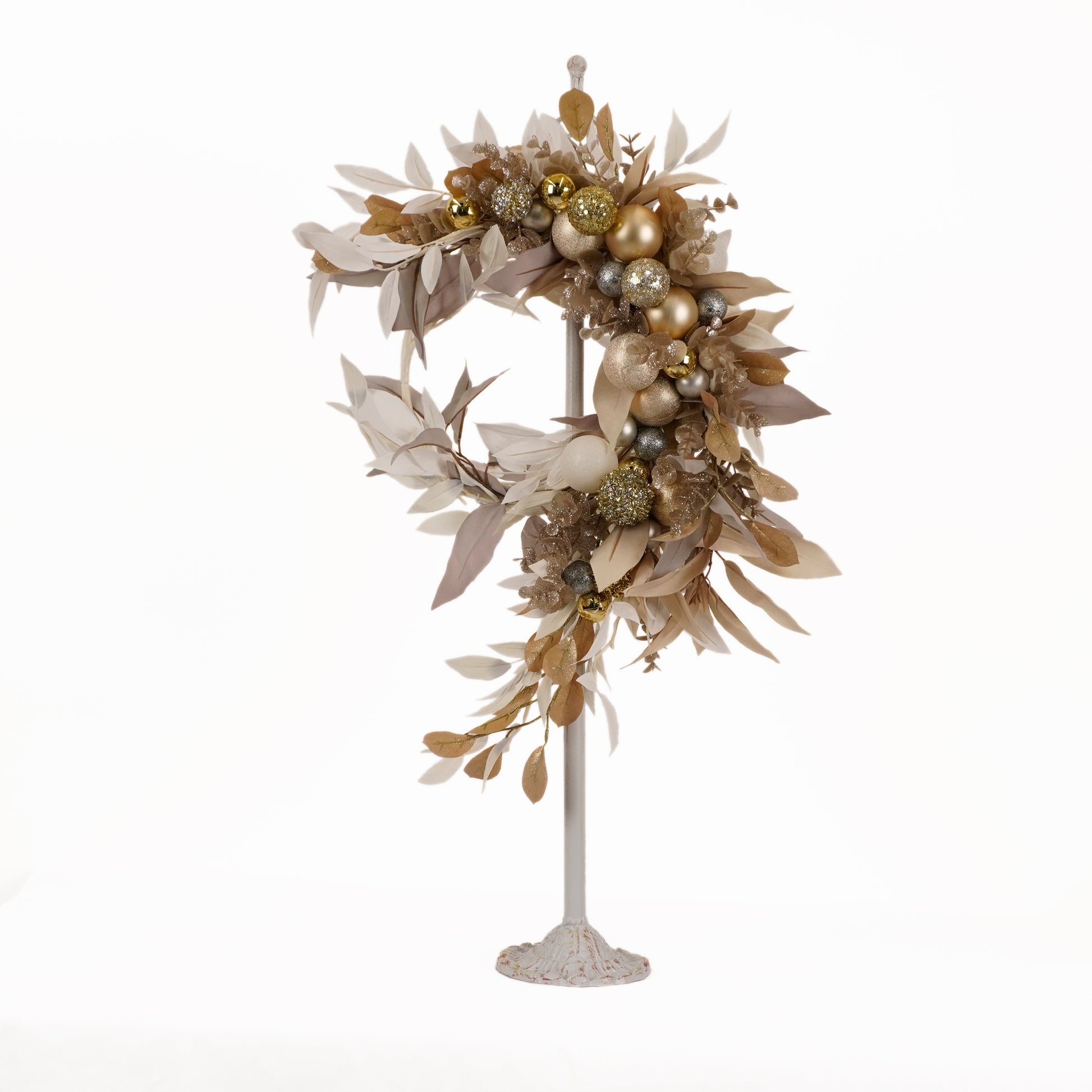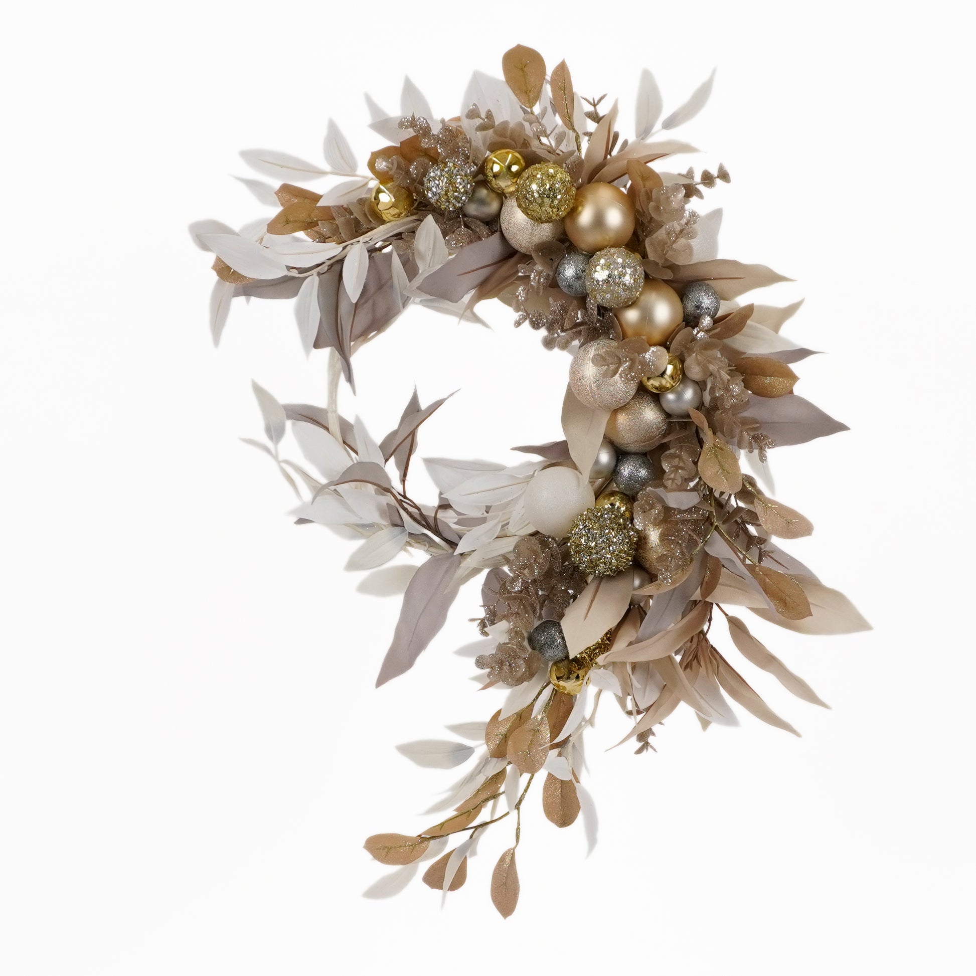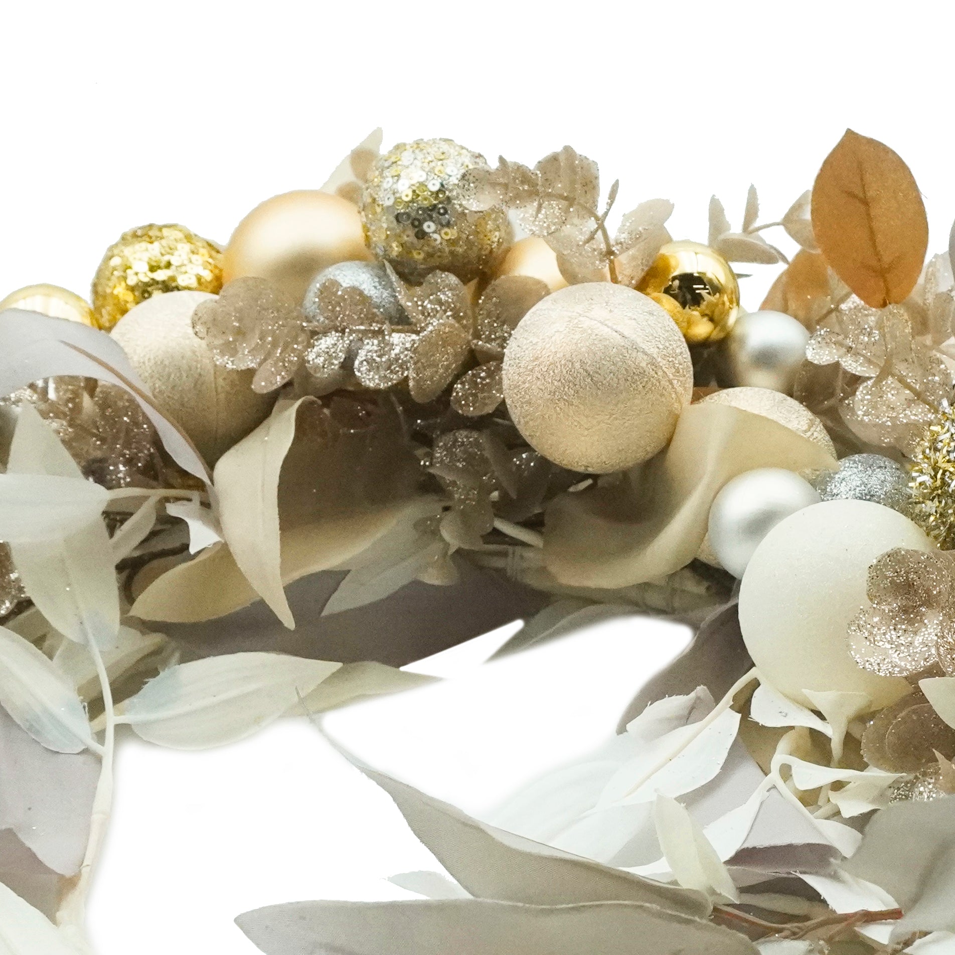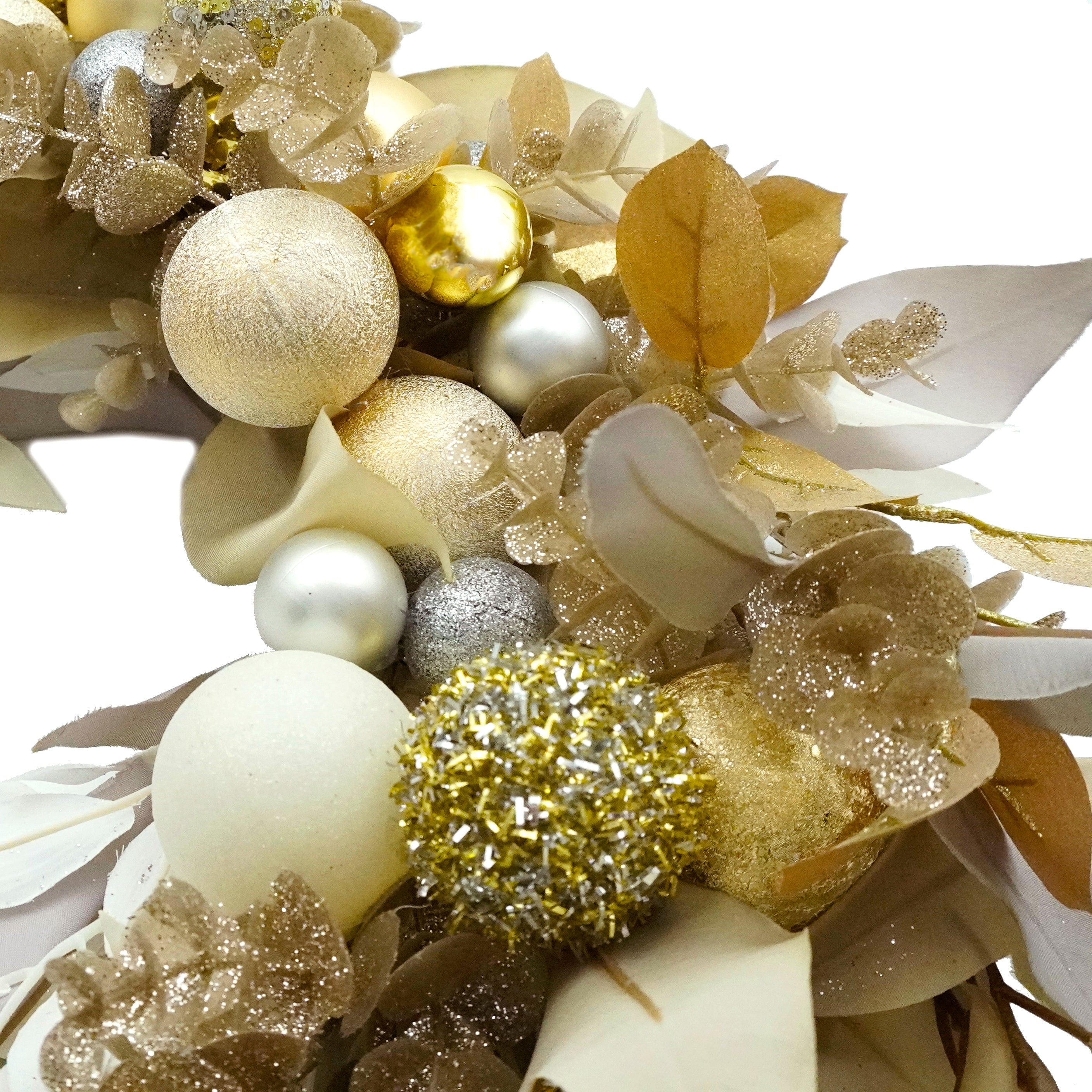 白やグレーのユーカリとゴールドラメのリーフ、さらにゴールドやシルバーカラーのオーナメントが贅沢な雰囲気を演出します。お玄関を華やかに彩り、リッチでゴージャスな雰囲気を醸し出す、上質なお飾りです。ウィンターシーズンのお出迎えを特別なものにする、エレガントな一品です。