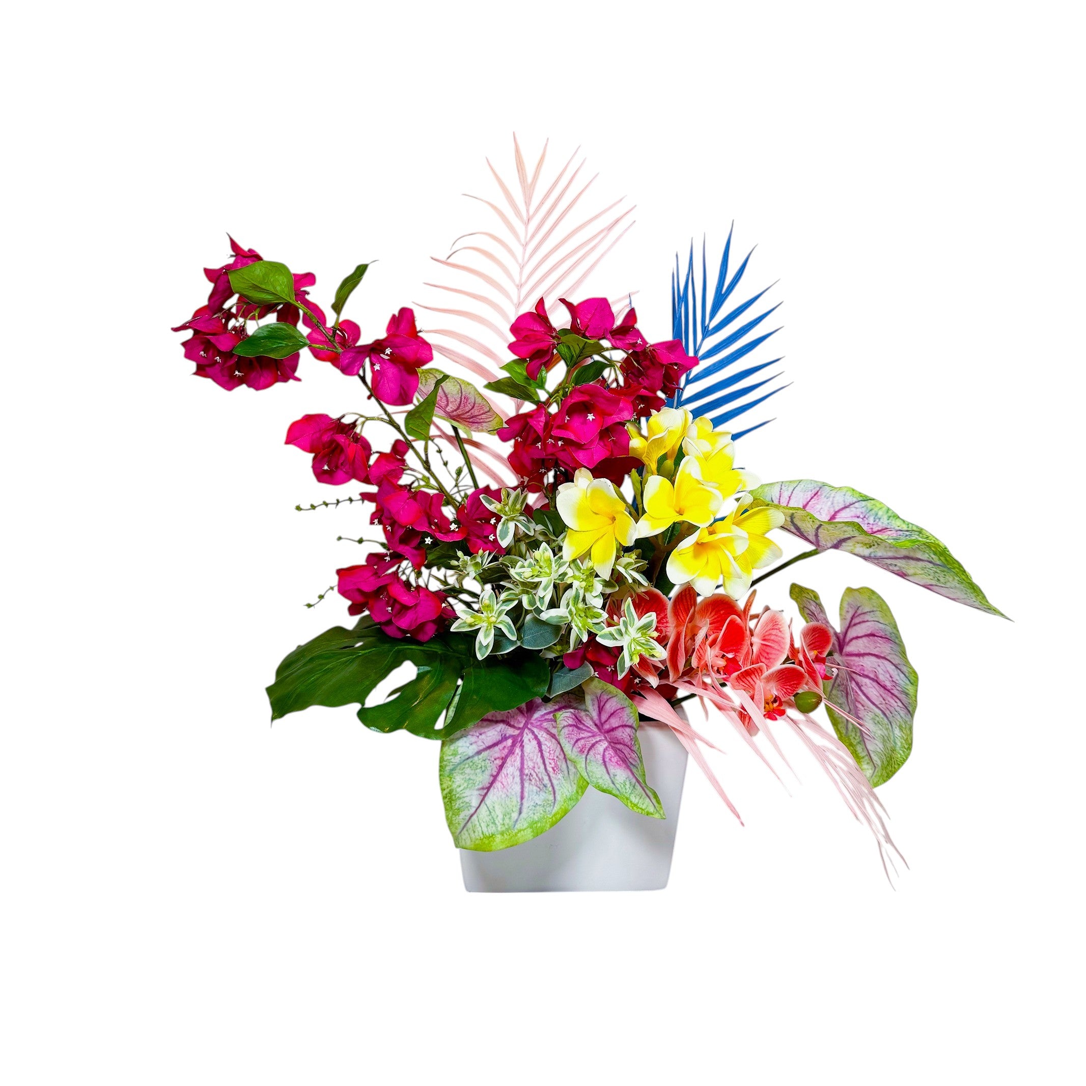 パステルカラーやピンクベースが爽やかなアレンジメントに、陶器でできたホワイトカラーの花器がピュアな南国気分にさせるオブジェ。盛夏をイメージさせるビビッドピンクのブーゲンビリア、イエローが美しいハワイの神聖な花プルメリア、オレンジカラーが際立つ胡蝶蘭、ピンクカラーがエキゾチックなカラジューム、切れ目のある葉が個性的なモンステラが豪華共演。なかでも珍しいピンクとブルーのパームは夏のバカンスのような、非日常を感じさせます。お祝いの品として、またご自宅のリビングや玄関を夏らしくアレンジしたい際に最適です。