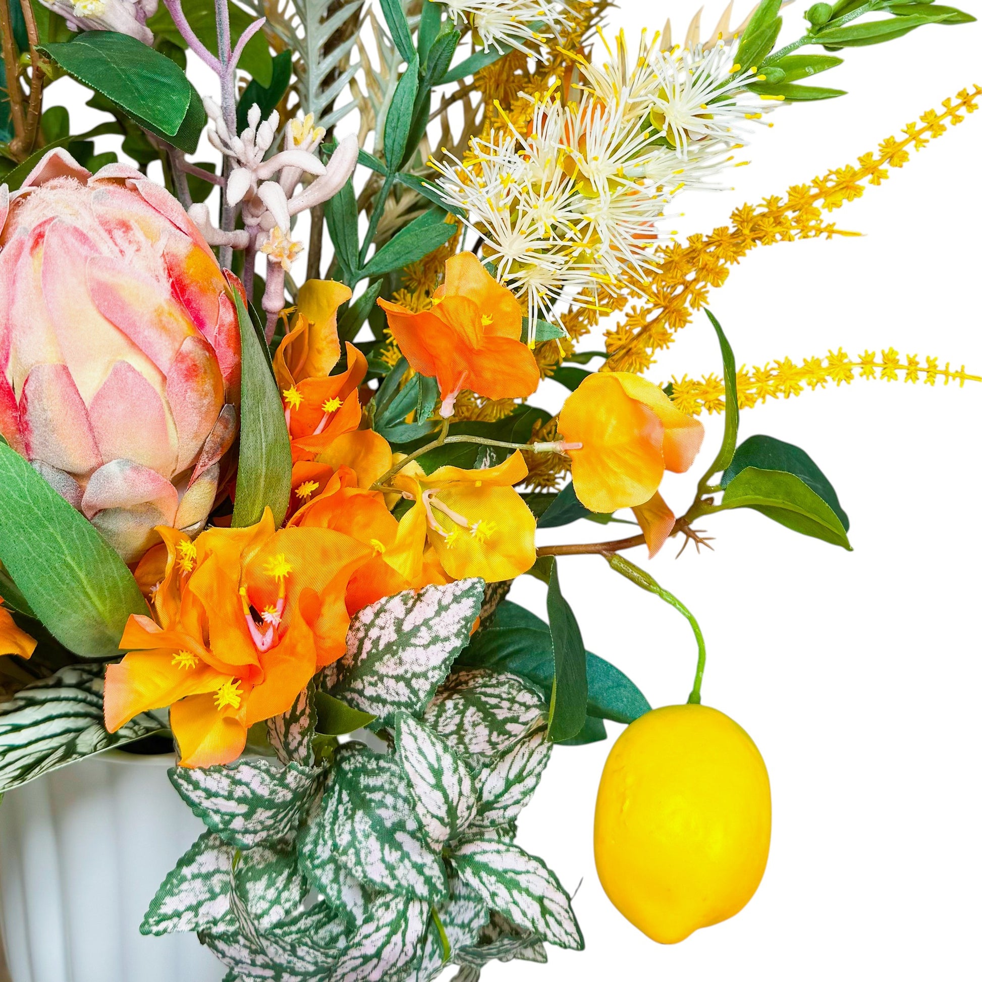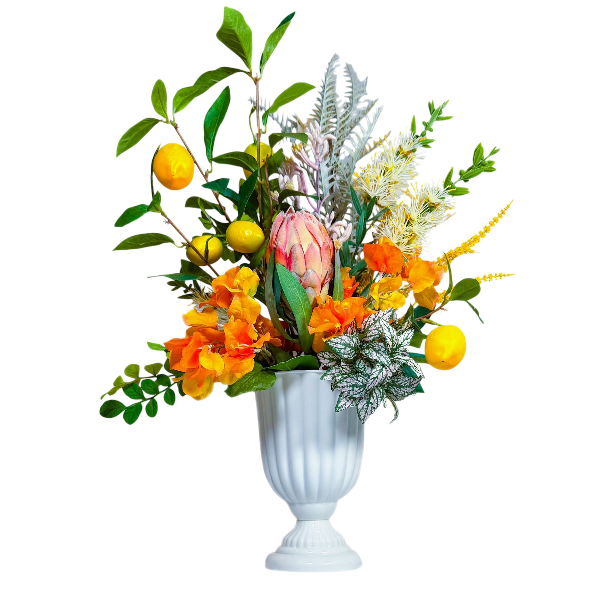 まるでアマルフィ海岸を吹き抜ける地中海の風のようで、柑橘の香りが漂うかのような、瑞々しく爽やかな雰囲気が魅力です。主役は、見ているだけで元気になれるレモン。オレンジのブーゲンビリアが陽気に彩りを添え、明るさと活力を感じさせます。中心には、個性的で存在感のあるプロテアが洗練された印象を演出。さらに、ハーブとしても親しまれるティーツリーや、ポルカドットプランツ、カンガルーポーなど、ホワイトグリーンの植物たちが全体をモダンにまとめ上げています。お祝いのギフトとしてはもちろん、元気を届けたい相手への贈り物や、空間に明るさを加えたいときのインテリアアイテムとしてもおすすめです。<※付属品:ポット*カラーはお選び頂けません。商品画像をご参照ください>