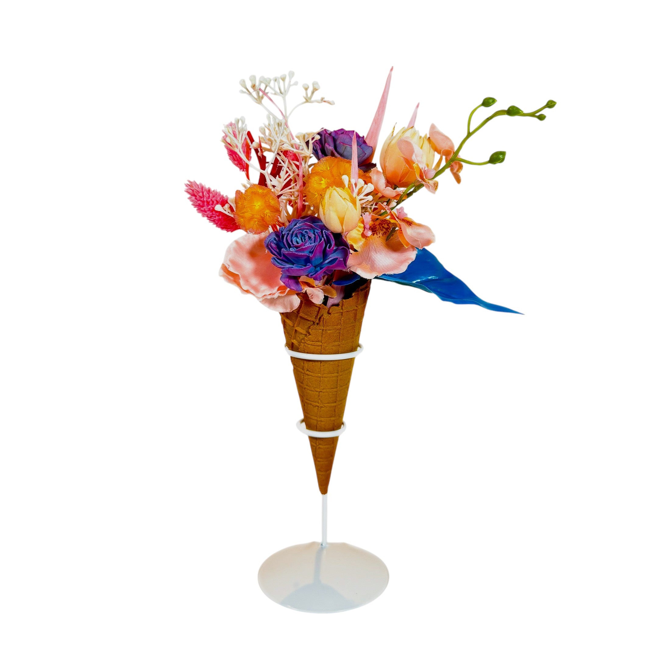まるでアイスクリームのような可愛らしさ。ワッフルコーンに入ったアーティフィシャルフラワーのブーケは、見た目のインパクトも抜群。付属のカップホルダーを使えば、玄関やカウンター、デスクの上などにそのまま飾れます。ブーケ部分だけを取り外して、お気に入りの花器に移すことも可能。渡しやすく飾りやすい、自由にアレンジできるおしゃれなアイテムです。