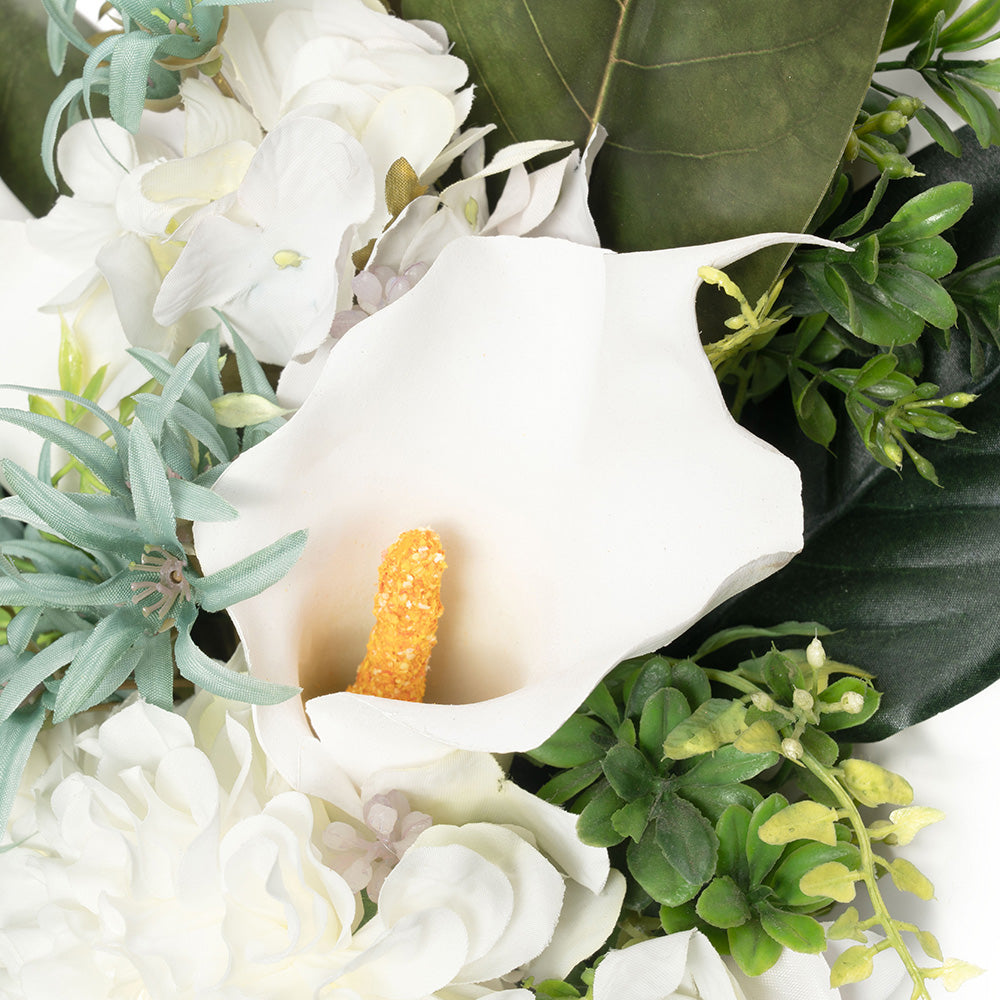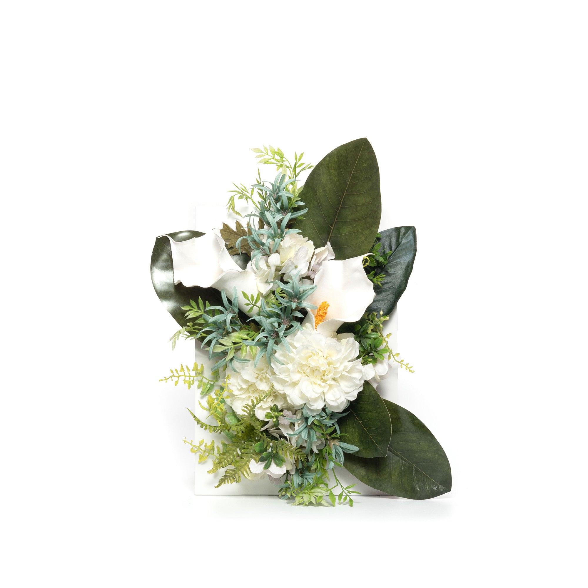 品の良さが際立つホワイトとグリーンを基調としたアレンジは、老若男女問わずお気に召して頂けることでしょう。花言葉が「乙女のしとやかさ」・「清純」・「華麗なる美」であるカラーや「優雅」・「華麗」のダリアは、様々なシーンでの贈り物やご自宅をエレガントに装うインテリアとして重宝するアレンジメントです。