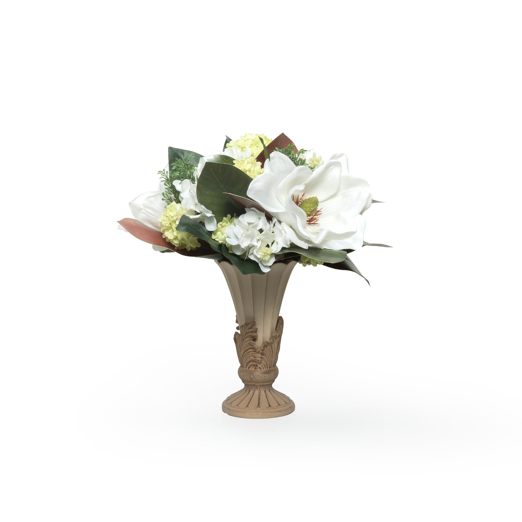 花言葉が「自然への愛」・「持続性」・「華麗」であるマグノリアは、その気品ある佇まいから、豪華なアレンジメントには欠かせないお花です。なかでもホワイトマグノリアはグリーンのリーフと相性がよく、ナチュラルでいて清楚で温もりすら感じさせます。また小さな花が集まって大きな花となるコデマリ(小出毬)は純白の花のイメージそのまま。紫陽花の清々しさも相まって、老若男女問わず喜んでいただけるアレンジメントです。あらゆる方の贈り物に。仕様(サイズ、重さ、素材)