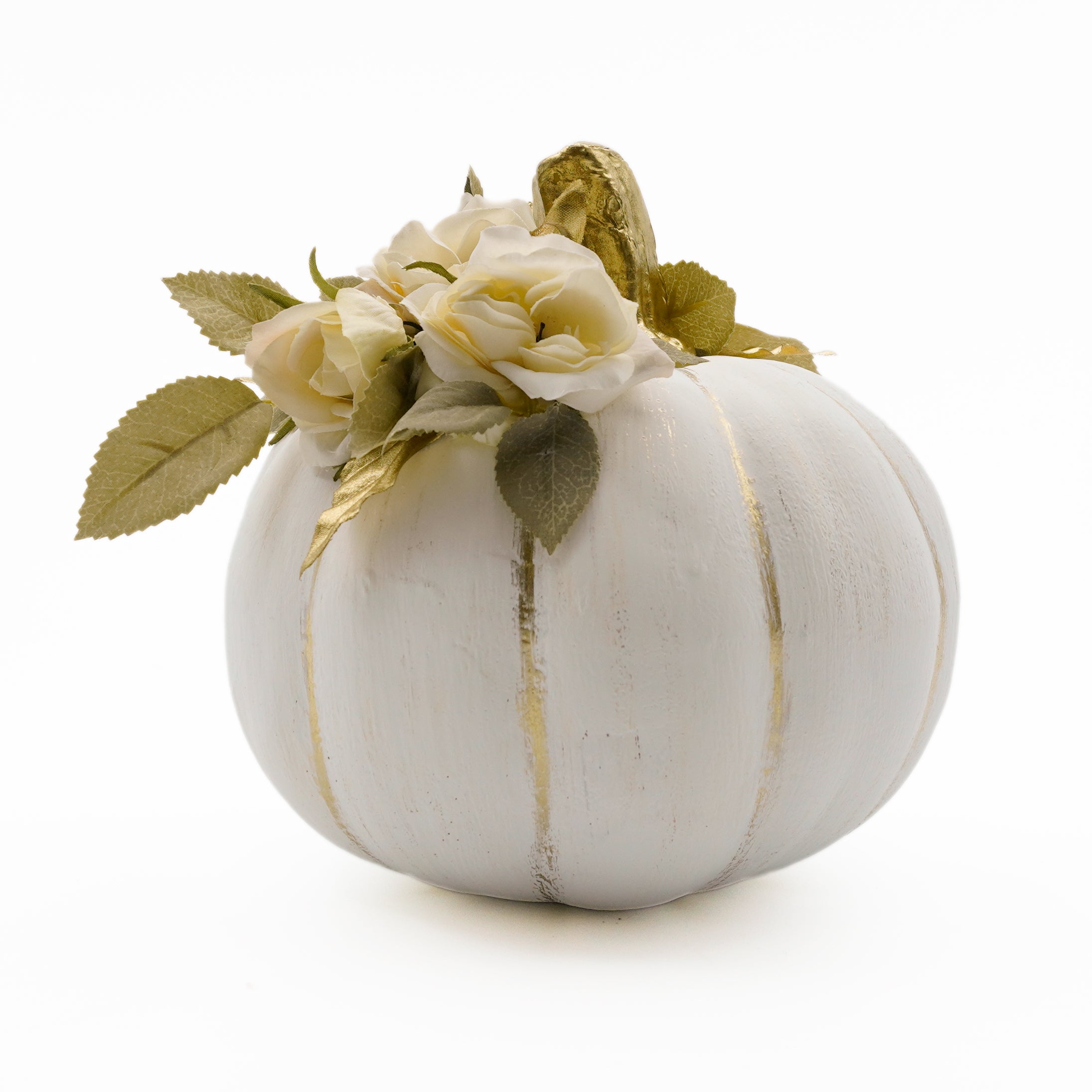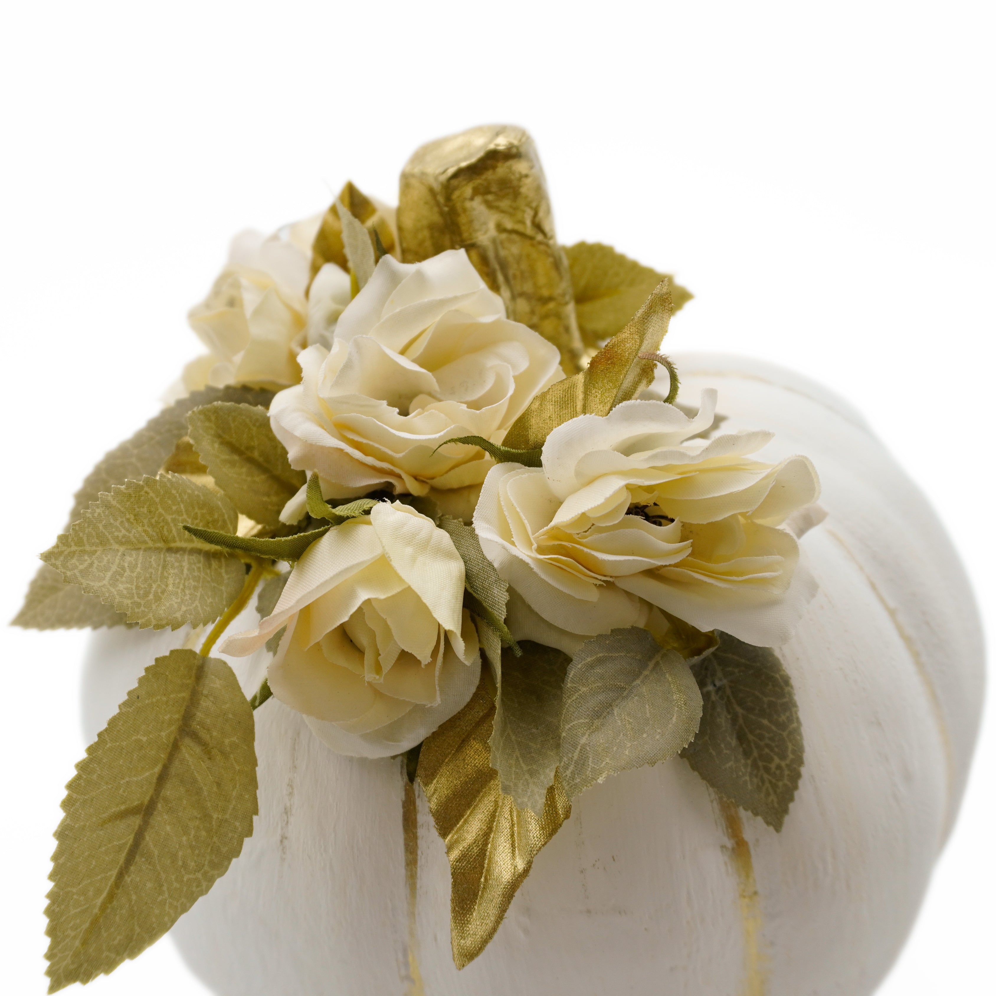 ホワイトのかぼちゃをベースに、ローズがアレンジされた一品。落ち着いた上品なインテリアとして華やかさを演出します。ハロウィンのパーティースペースなどの小物としても使い勝手が良く、お部屋のワンポイントに、玄関やウェルカムスペースなどに飾るだけで、場が華やぐでしょう。