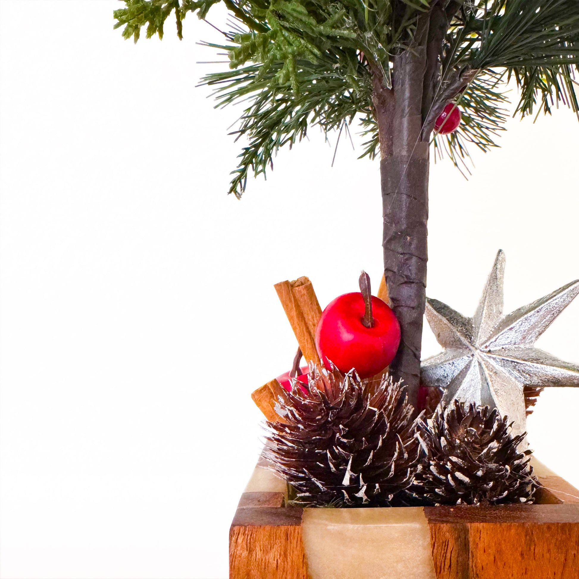 ウッドベースに樹脂加工が施された本格的な花器には、モミの木、ペッパーベリー、赤い実を贅沢にアレンジ。ツリーの根元にはノグルミやリンゴ、シナモン、松ぼっくり、煌めくシルバーのスターが所狭しと並び、トップにはシルバーのスターが輝きます。ミニサイズながらも存在感のある本格的なツリーです。もちろんお好みのオーナメントを追加でデコレーションすれば、あなただけのオリジナルツリーに。